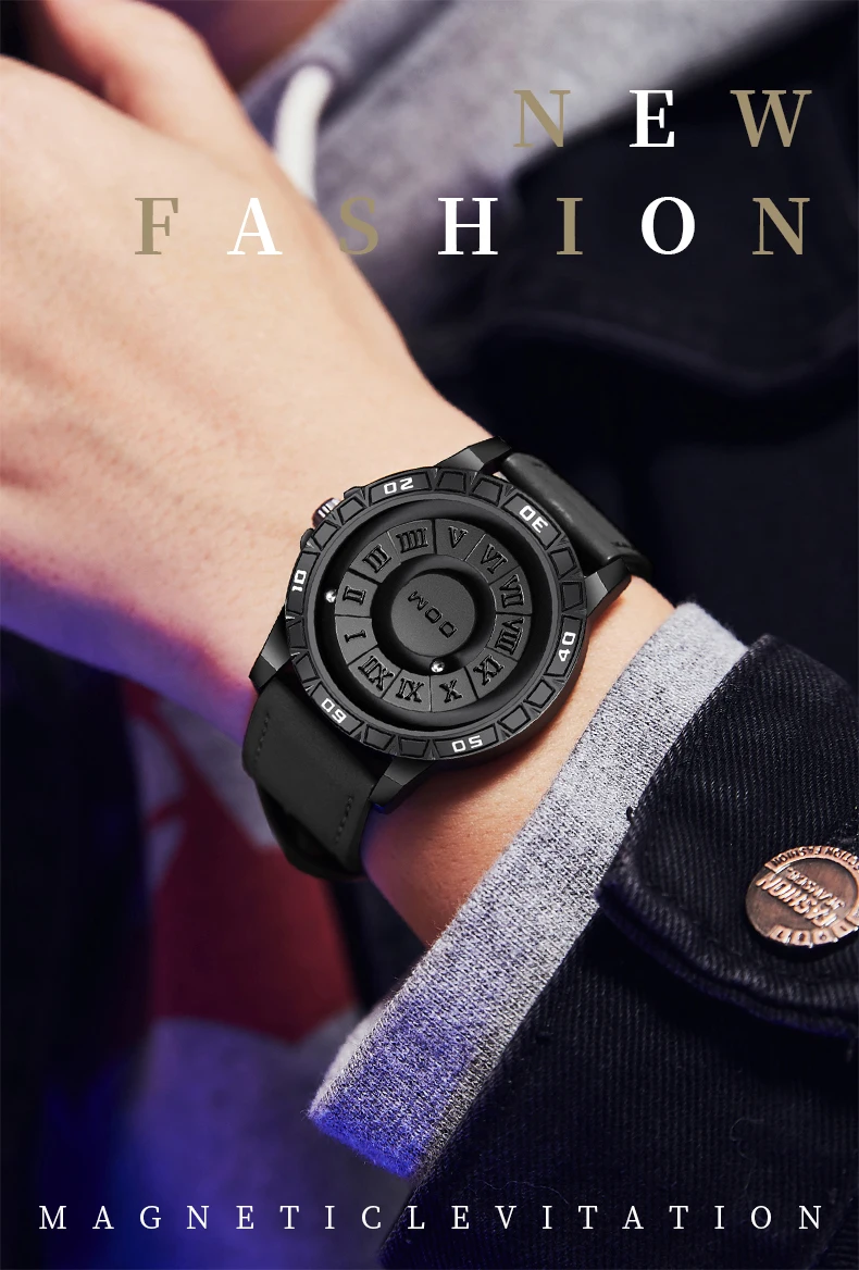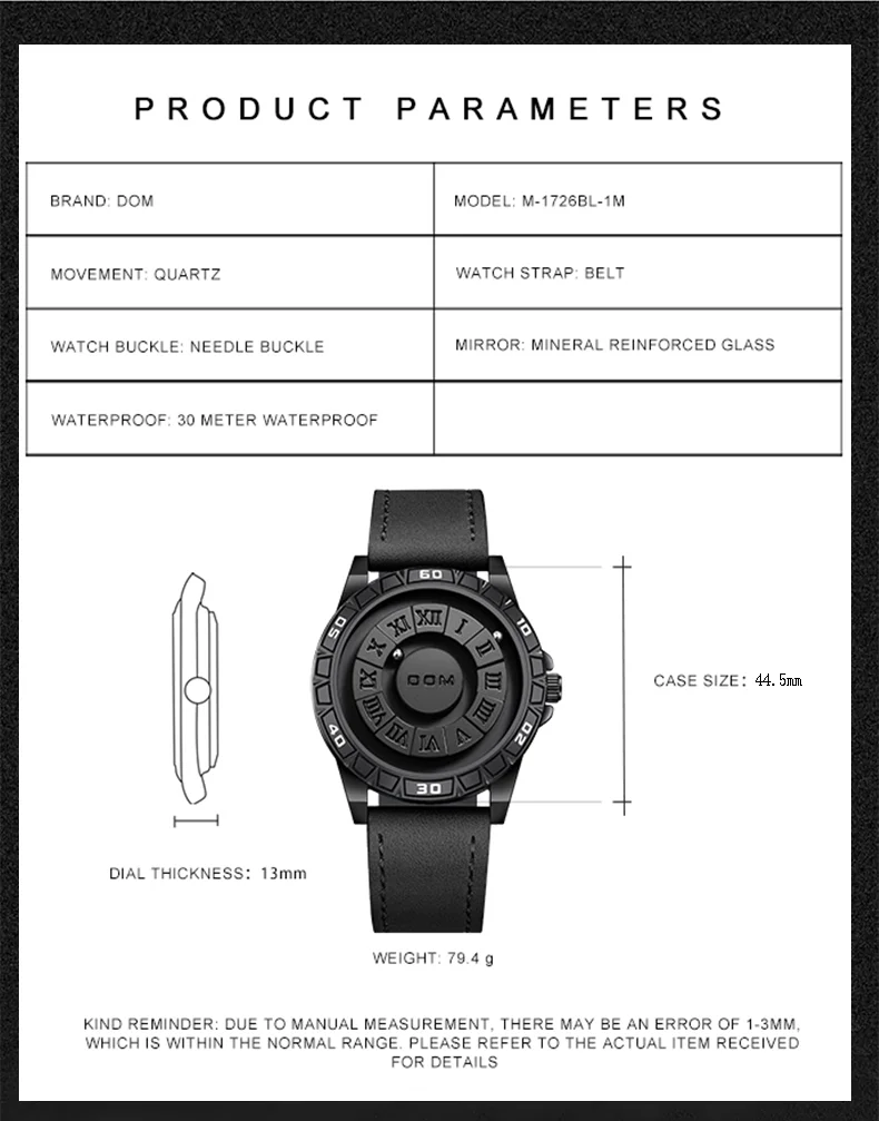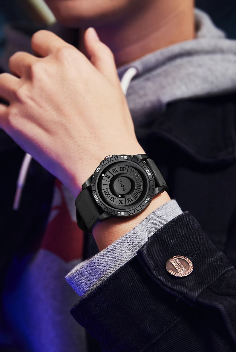 The DOM 1726 combines creativity and style with its unique magnetic rolling-pointer display. Built with a stainless-steel case and leather strap, it features CITIZEN quartz movement, luminous hands, day/date functions, stopwatch, and 3BAR water resistance. A bold fashion-luxury watch for men who want modern design with everyday durability.