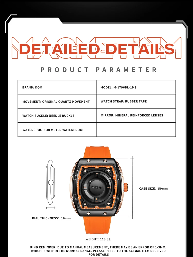 The DOM 1796 features a stainless-steel case, silicone band, luminous Roman-numeral dial, and reliable CITIZEN quartz movement with day/date functions. Built for everyday style with 3BAR water resistance, backlight, and a long-lasting 24-month battery.